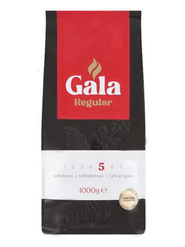 Gala Regular, 1 kg Kaffeebohnen, kräftiger und charaktervoller Kaffee mit Noten von dunkler Schokolade und einem würzigen Abgang. Bewährte Qualität und frisch für Sie geröstet.