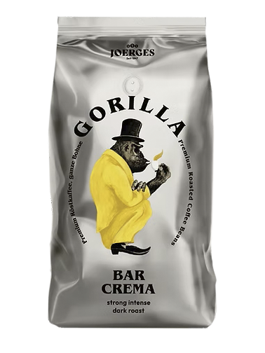 Gorilla Bar Crema, 1 kg Kaffeebohnen, purer Espresso-Genuss mit Noten von Schokolade, Nüssen und Gewürzen. Der kräftige Extra-Kick für köstliche Kaffeespezialitäten, wie Espresso, Latte Macchiato oder Cappuccino.