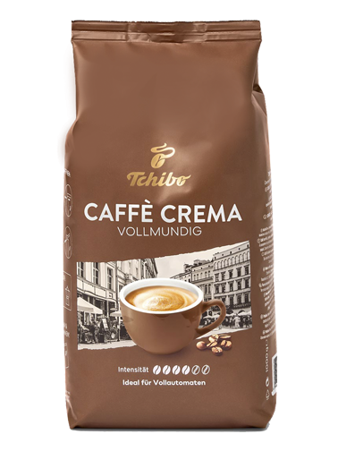 Tchibo Caffè Crema Vollmundig, 1 kg Kaffeebohnen, vollmundig und aromatisch, gekrönt von einer samtigen Crema. Ein unglaublich geschmackvoller Kaffee aus aromatischen Tchibo Arabica- und vollmundigen Tchibo Robusta-Bohnen. Perfekt auch als Milchkaffee. Intensität 4 von 6.